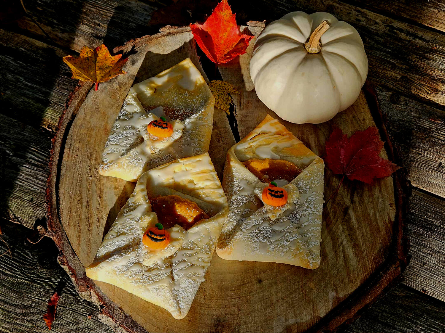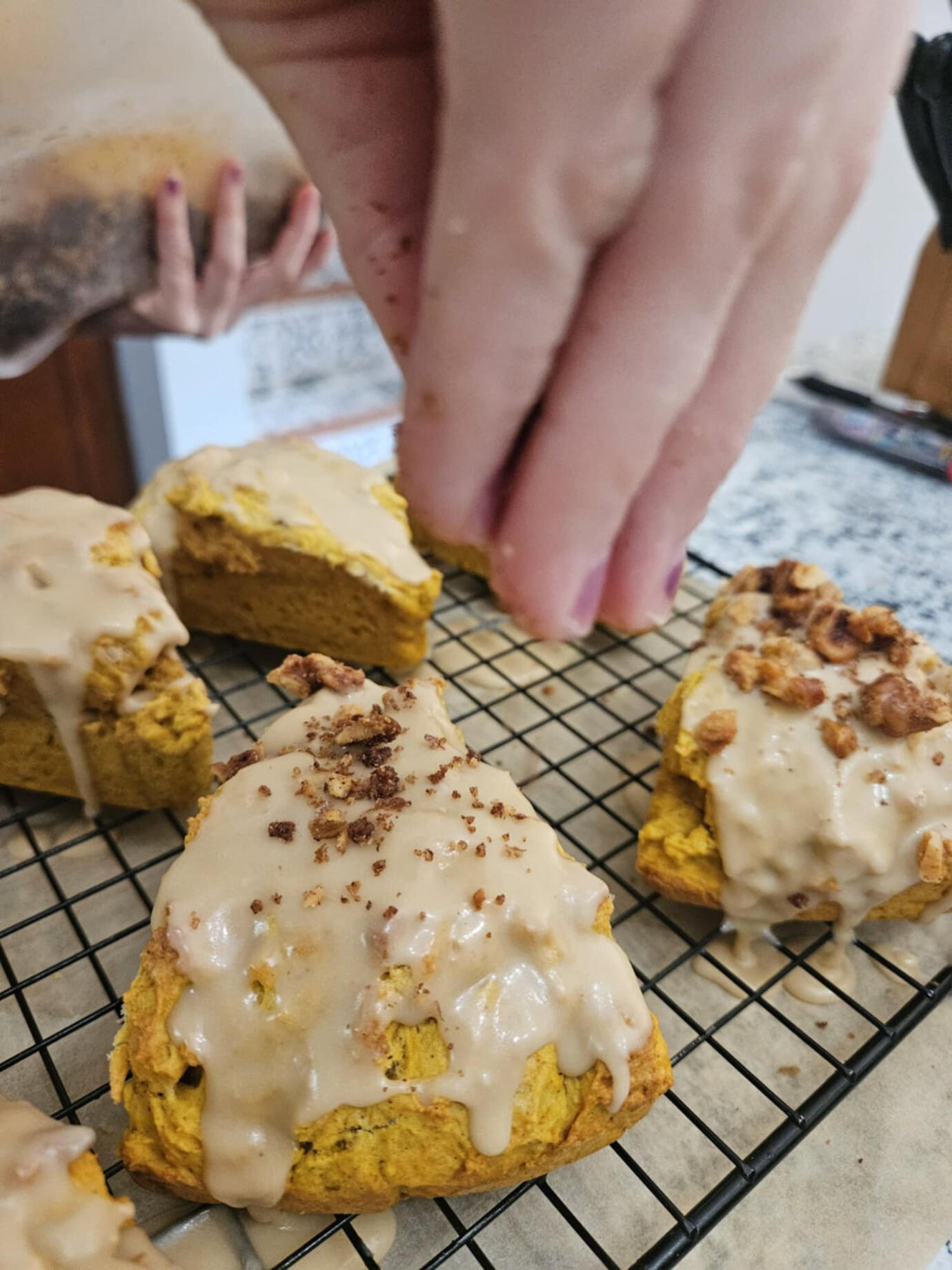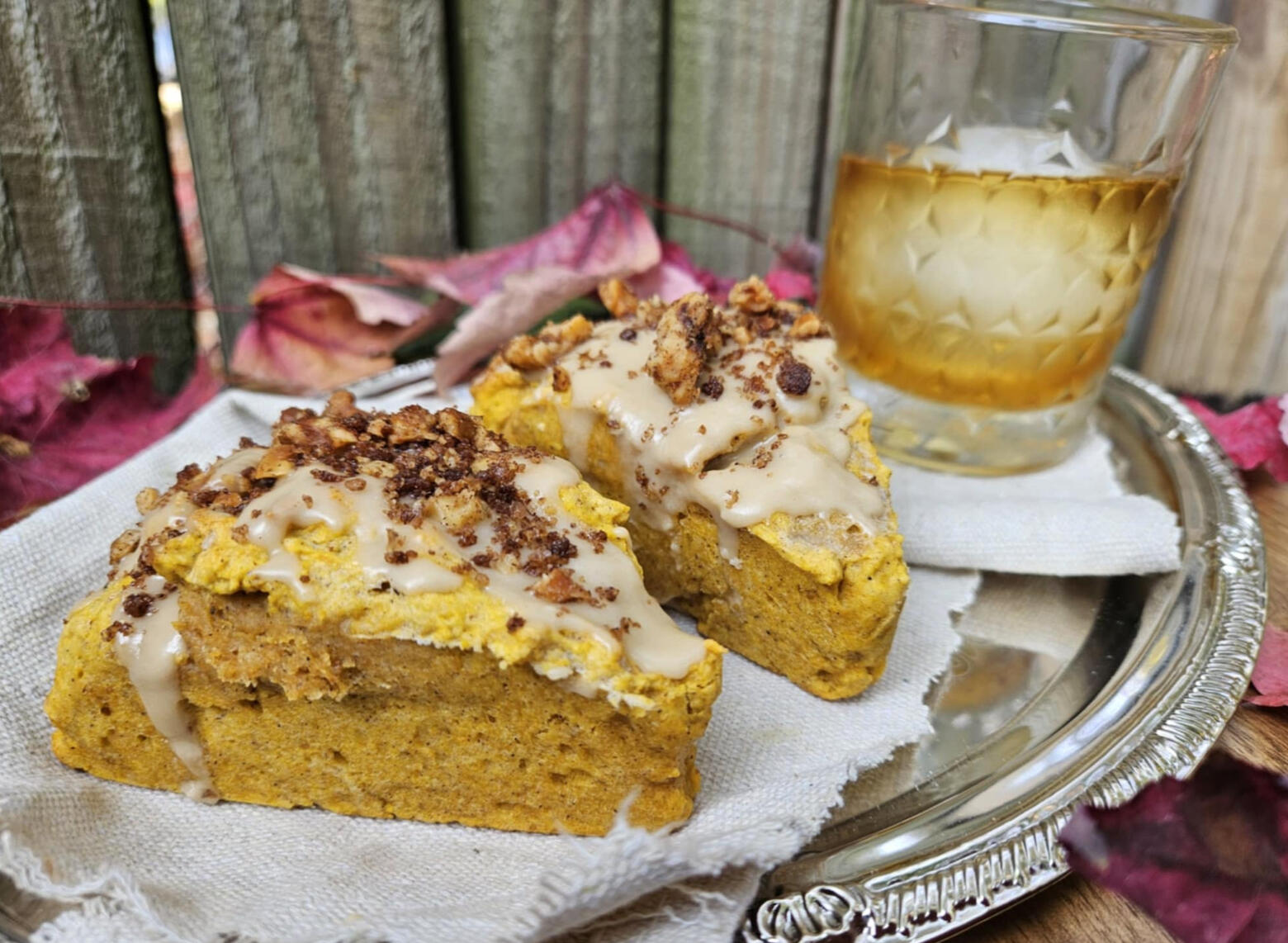Bourbon Maple Pumpkin SconesPumpkin scones crafted with a "four cask" bourbon- a blend of whiskeys finished in rum, cognac, sherry, and maple syrup barrels. Further enriched with maple syrup aged in these same barrels. The decadent glaze is made with the “four cask” bourbon and maple syrup. Topped with maple bourbon candied walnuts for an irresistible crunch.12 copper a piece