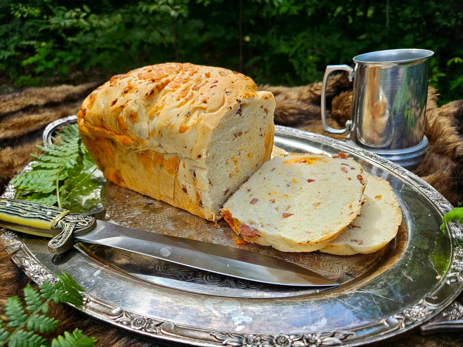 Cheddar and Whiskey Bacon Bread LoafSomething savory in the shop! Bits of cheddar and whiskey bacon baked into a loaf of bread. Perfect for a hearty, savory slice of toast with breakfast in the morning.1 silver per loaf