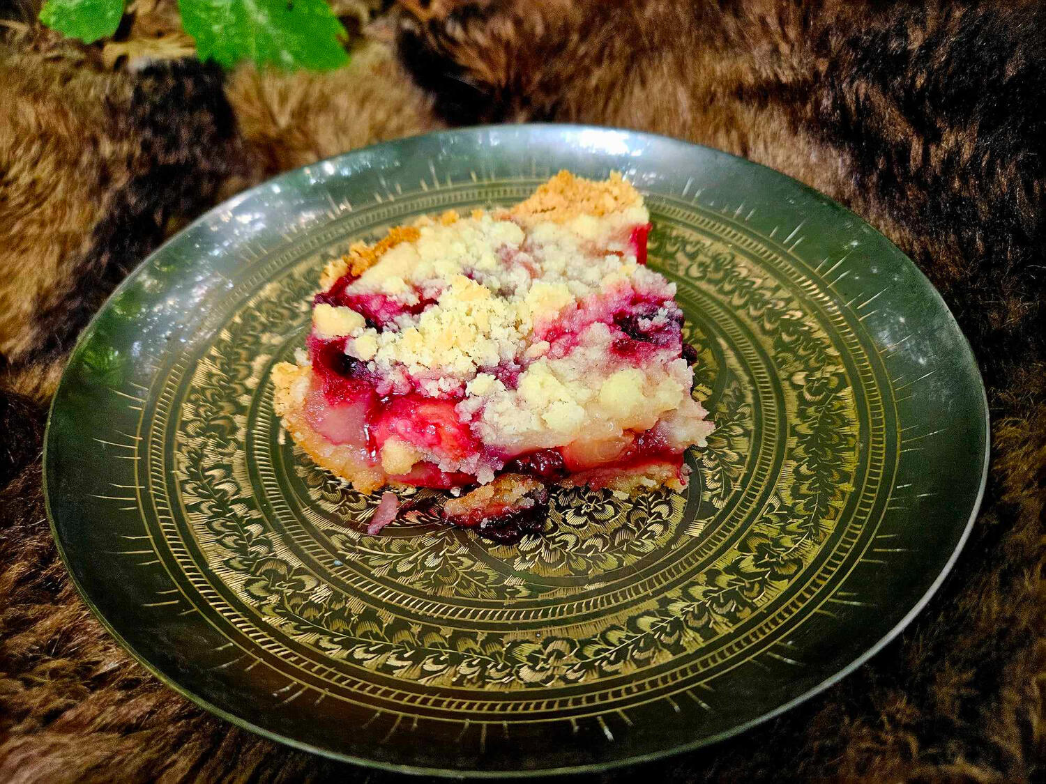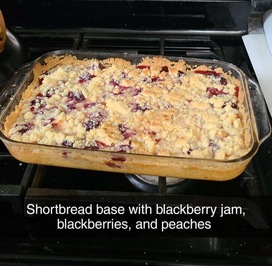 Whiskey Soaked Blackberry and Peach ShortbreadFresh blackberries and peaches are soaked in whiskey before being used in baking. Little squares of a crumbly, layered cobbler are a perfectly sweet treat with a bite.9x13in shortbread - 1 silver