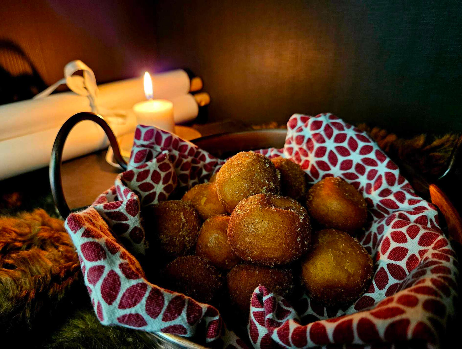 Sweet Rum BombsSoft cinnamon and sugar fried pastry bites filled with a gooey coconut rum icing. Kept warm in an Asuran tech warming box!Ask for them boxed to take home or in a to-go bowl with chopsticks to eat right away!3 copper a piece