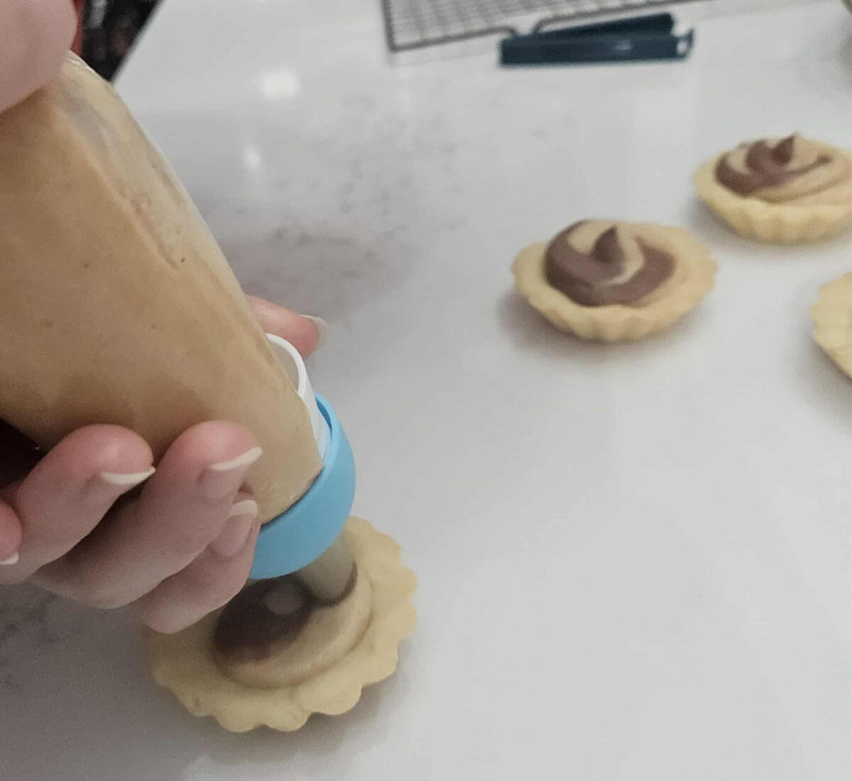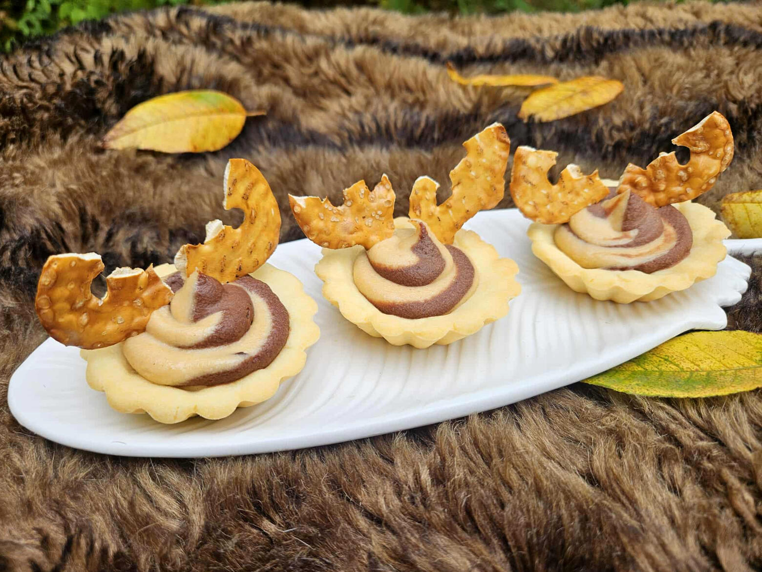 A rich and creamy dark chocolate and peanut butter mousse swirl is infused with whiskey and served in a tart shell with pretzel chip antlers.5 copper each