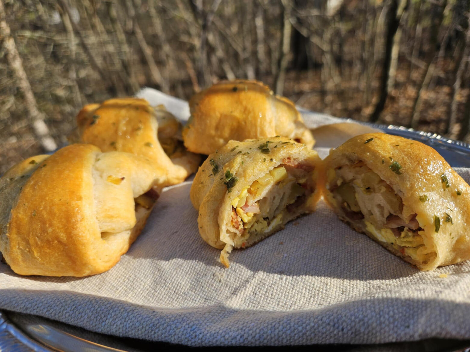 (New!) Journeyman's RollsAn easy-to-carry, hearty meal. A buttery crescent roll stuffed with whiskey-smoked bacon, golden potatoes, onions, red peppers, eggs, cheese, and fresh basil and parsley, then brushed with melted garlic-herb butter.8 copper each